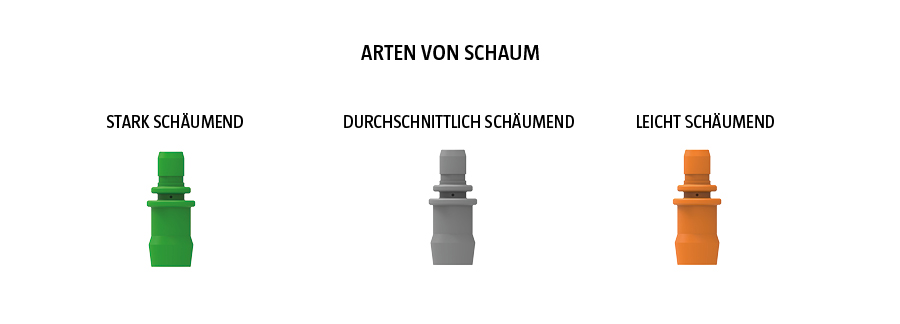 Das Sprühgerät ist mit drei Mischern (orange, grau und grün) ausgestattet, die es ermöglichen, die Art des Schaums zu variieren, indem zwischen Leicht schäumend, Durchschnittlich schäumend oder Stark schäumend gewählt wird.