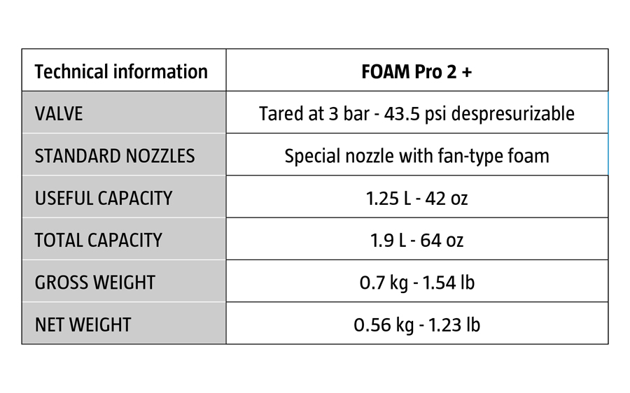 The IK FOAM Pro 2+ professional sprayer has been manufactured for the generation of dry, dense and durable foam. Designed to be used with chemical agents with surfactant properties for applications in professional cleaning, sanitation and disinfection, HVAC system cleaning, vehicle washing and detailing, as well as for the disinfection of food processing areas and industrial kitchens.