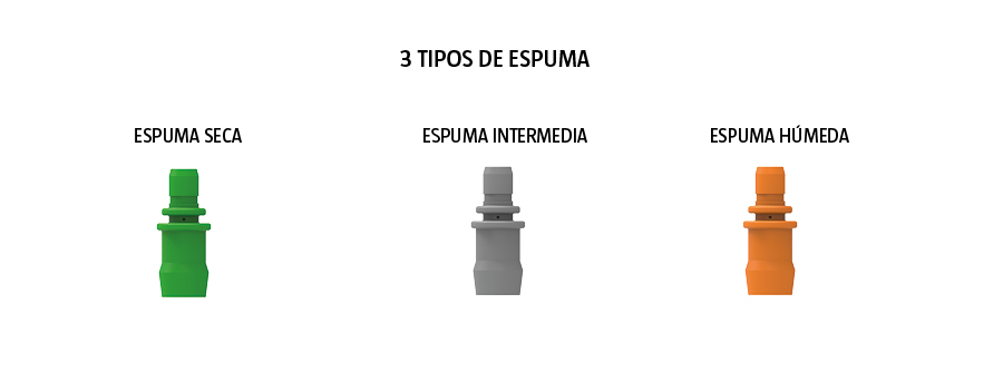 El pulverizador está equipado con tres mezcladores (naranja, gris y verde) los cuáles permiten variar el tipo de espuma pudiendo escoger entre espuma húmeda, intermedia o seca.