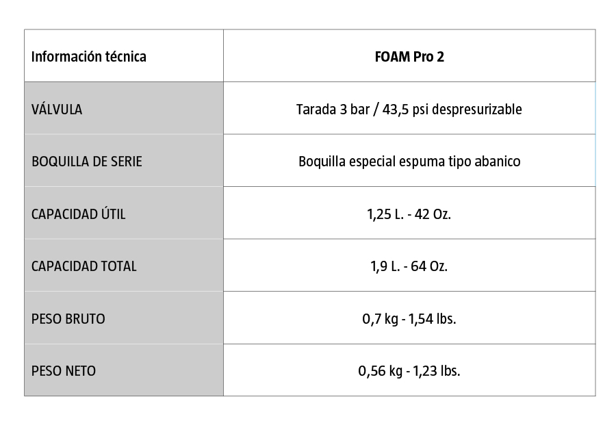 El pulverizador profesional IK FOAM Pro 2 ha sido fabricado para la generación de espuma seca, densa y duradera. Diseñado para ser empleado con agentes químicos con propiedades + surfactantes (tensoactivos) en trabajos de limpieza profesional, saneamiento y desinfección, limpieza de sistemas de climatización (HVAC), lavado y detallado de vehículos, así como para la desinfección de áreas de procesado de alimentos y cocinas industriales.